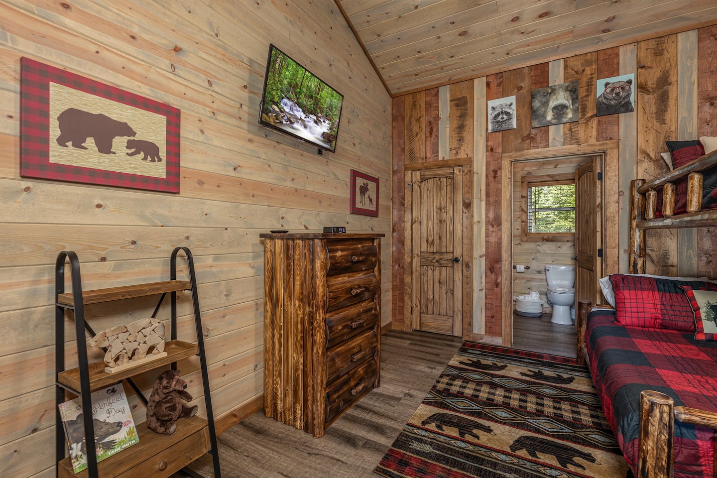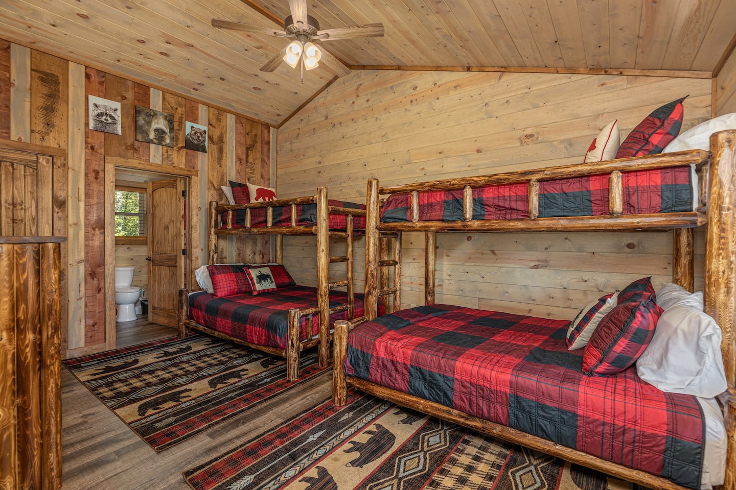 ▪️ Two Torched Cedar Log Twin-over-Queen Bunk Beds with luxury mattresses and matching chest of drawers