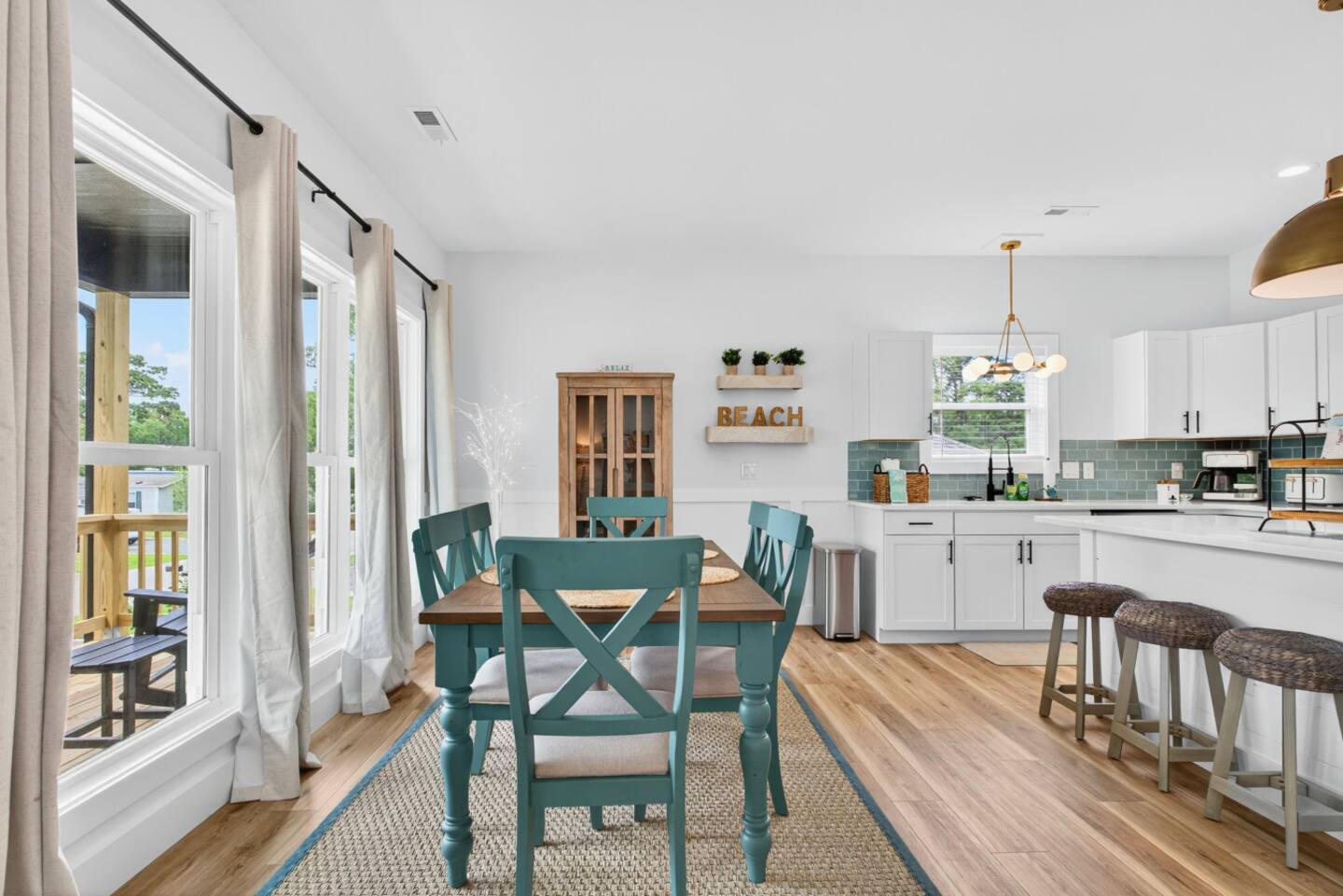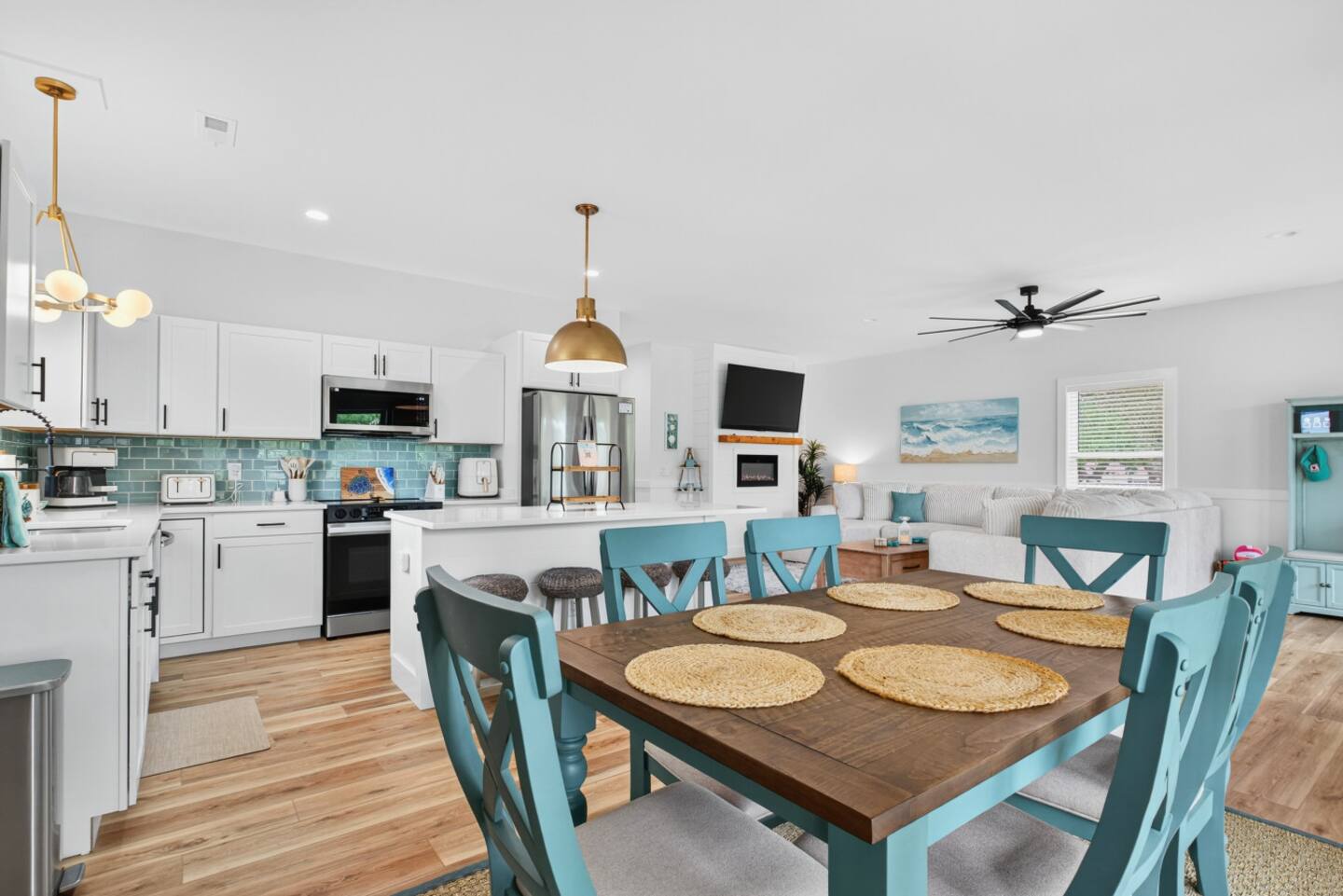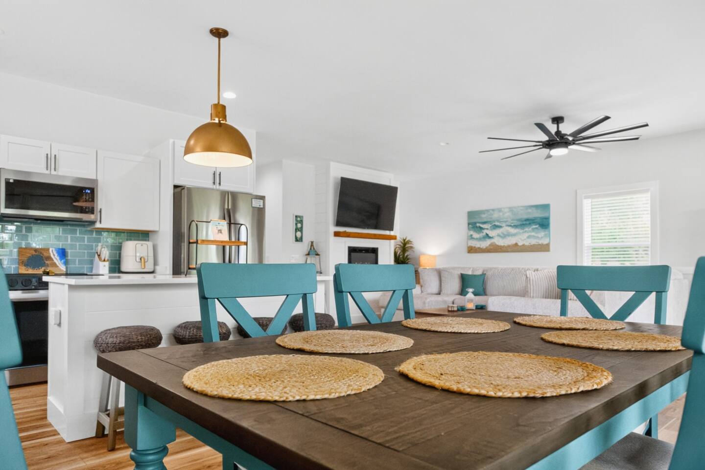 ▪️ Spacious dining accommodations include a 6-person coastal wood dining table & chairs and kitchen island featuring four boho-style wood bar stools