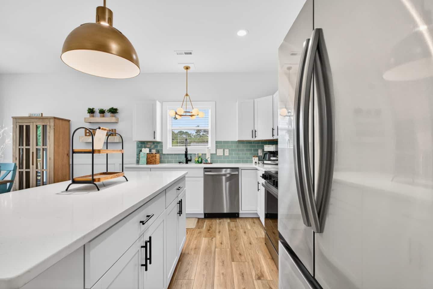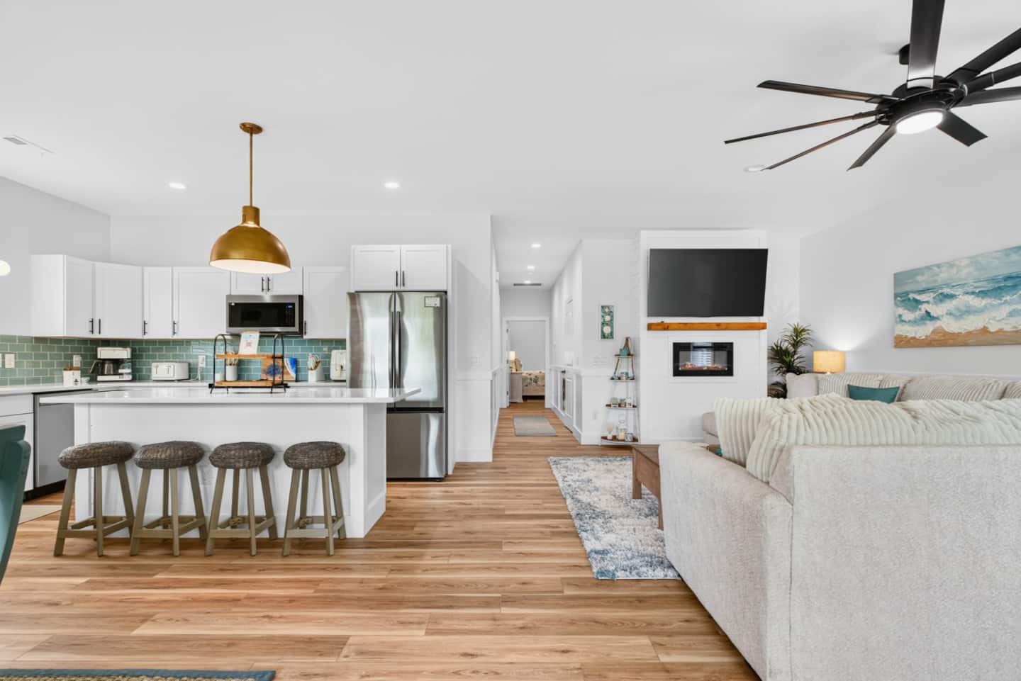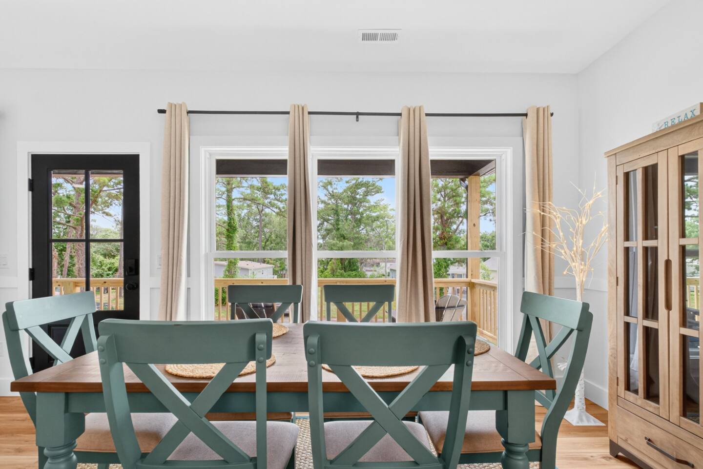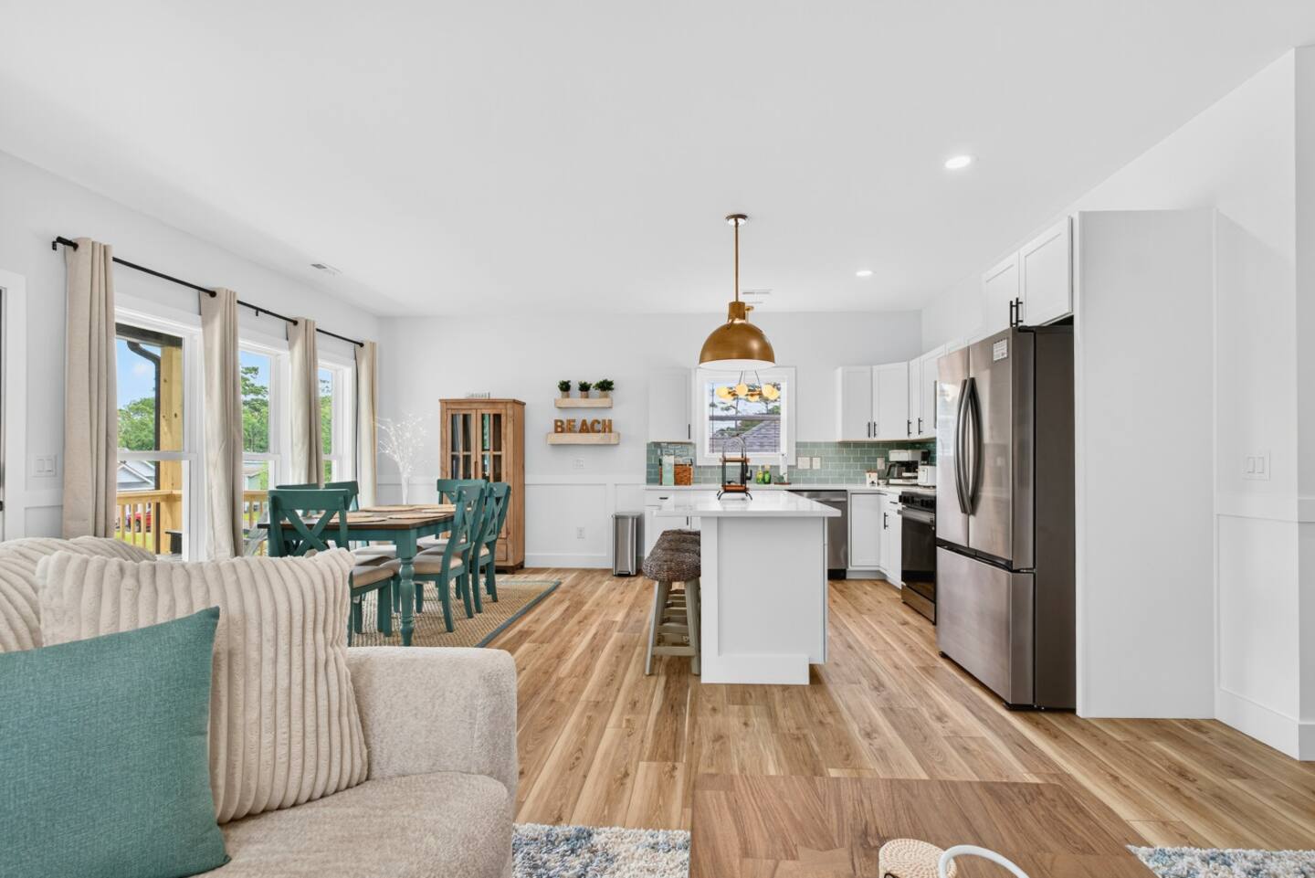 ▪️ Spacious dining accommodations include a 6-person coastal wood dining table & chairs and kitchen island featuring four boho-style wood bar stools